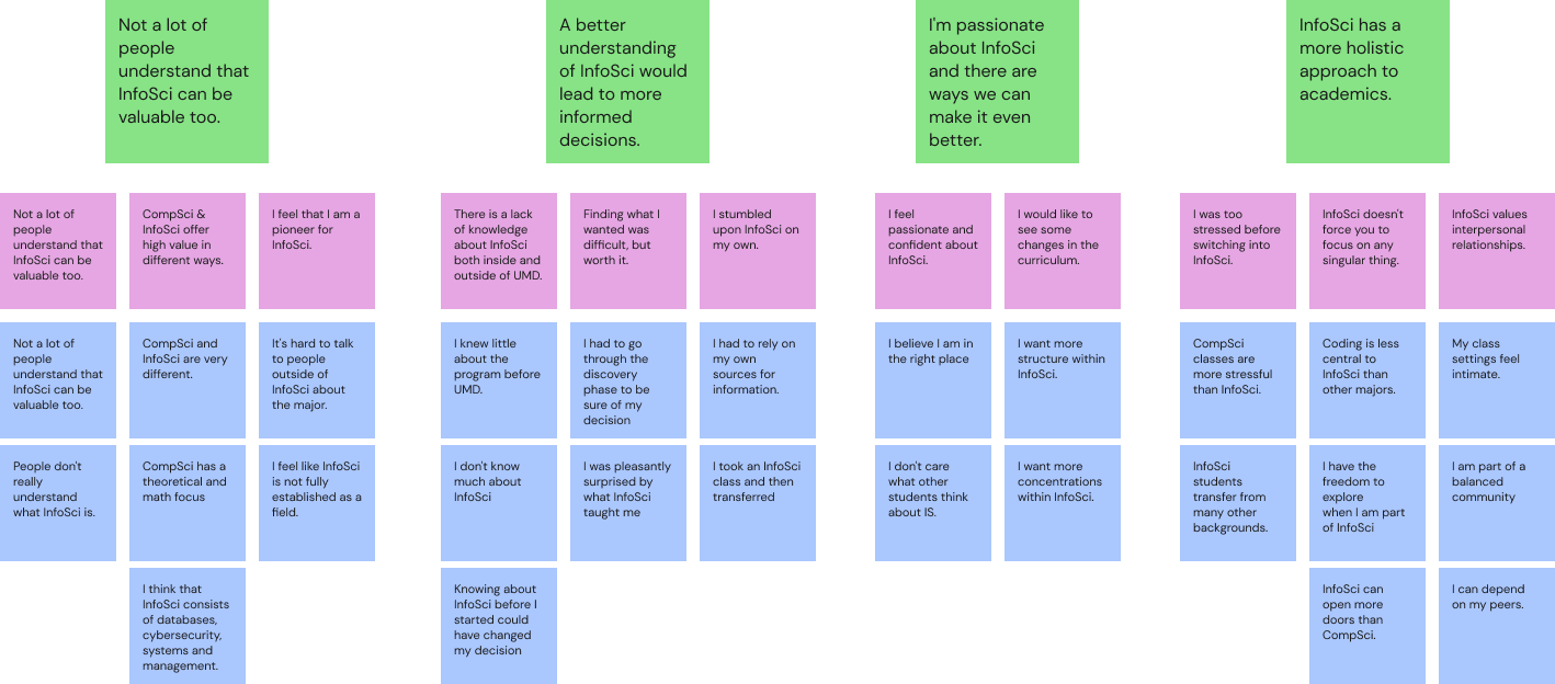I, along with my team, conducted six contextual interviews with various stakeholders to understand their needs, motivations, goals, and perspectives. We also interviewed some students from similar courses like Computer Science (CompSci) to understand their views on InfoSci. The interviews consisted of open-ended questions to help us gauge what different user groups expect and stand to achieve from this program.