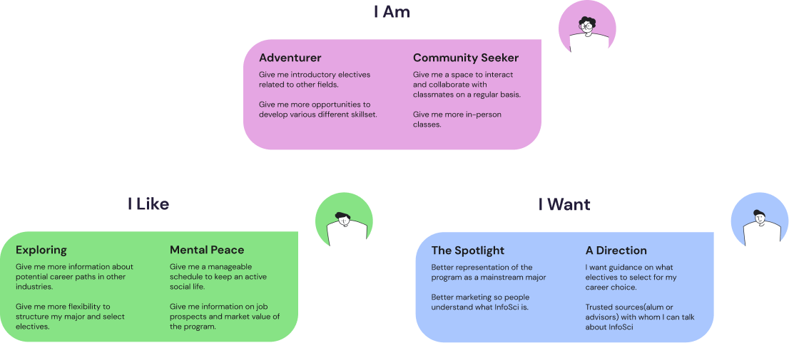 At its essence, Information Science (InfoSci) exists at the convergence of technology, design, and people. Despite being the fourth-largest program at UMD iSchool (College of Information Studies), there exists a lack of awareness among some students about the program. Here's how my team and I partnered up with the InfoSci committee to make the program better and solve important student problems.