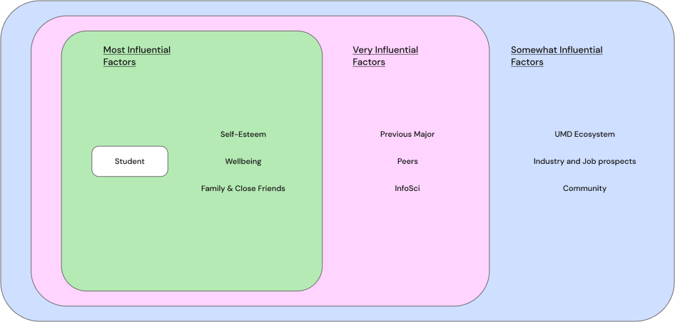 There are a lot of factors that affect a student's decision on choosing a major or transferring to a different one. This model captures how other people play a part in the student's life and the level of emotional connection they have with the student. Our take on this model is a bit unconventional. We decided to add in abstract concepts like 'Self-esteem' and 'Wellbeing' as they were also deciding factors for students transferring into InfoSci.